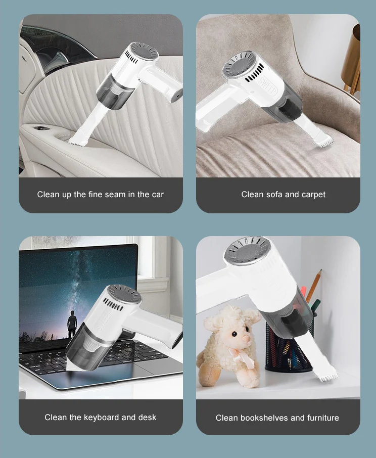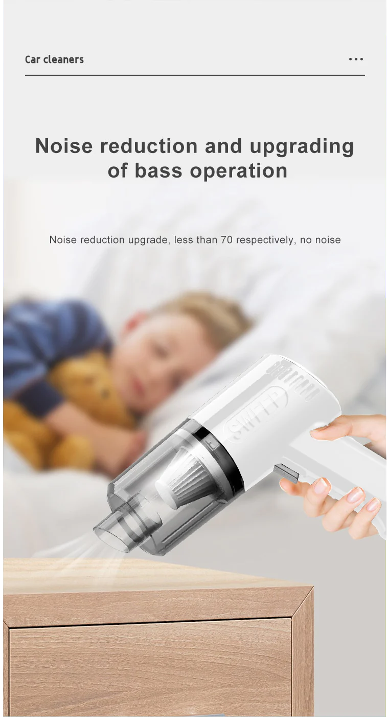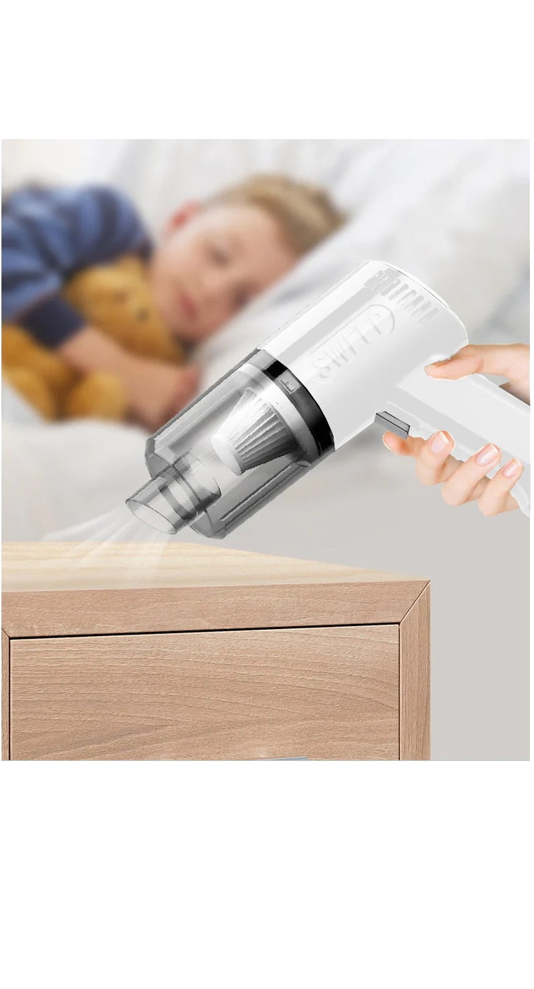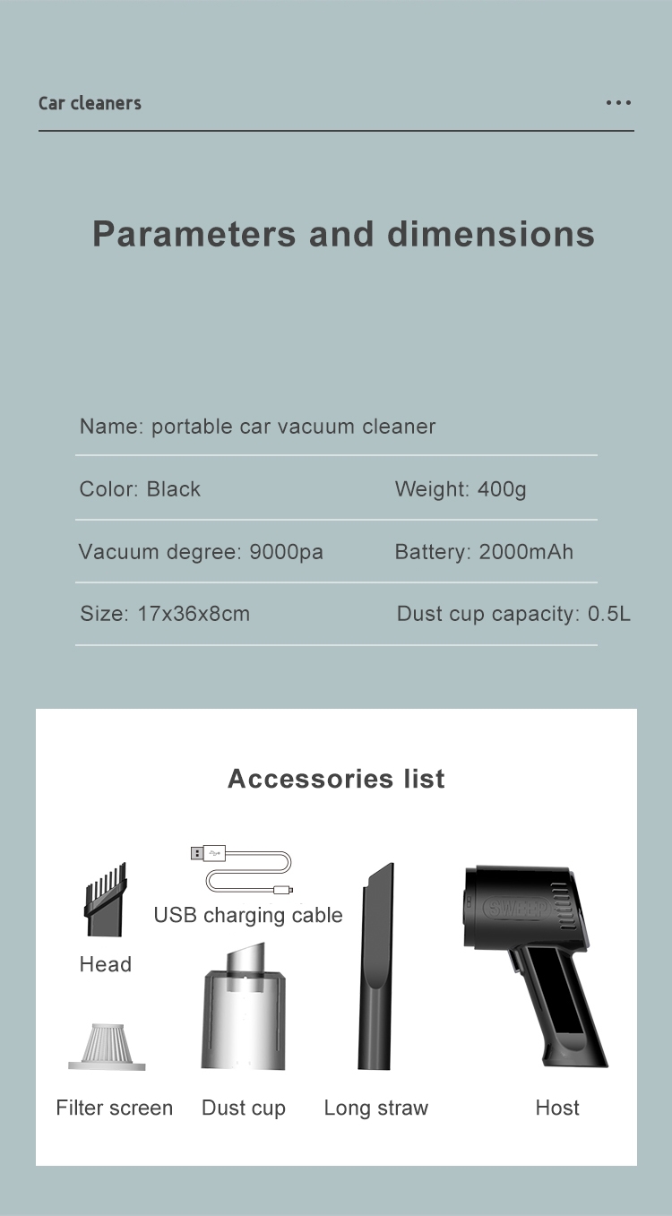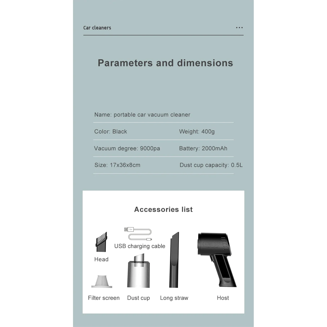 Nume Aspirator protabil Articol nr. XM-13 Dimensiuni 17 * 36 * 8cm Grad de vid 9000Pa Putere 120W Timp de lucru 30 de minute Greutate neta 400g Zgomot 70dB Alimentare electrica Baterie reincarcabila Li-ion USB Capacitatea bateriei 2000mAh Capacitate de praf 500 ml