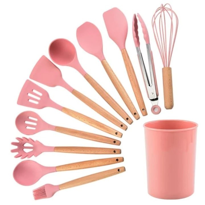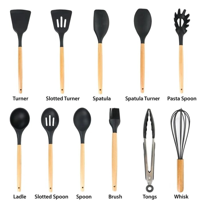 Setul include 12 ustensile pentru gatit confectionate din silicon care se vor potrivi tuturor nevoilor dumneavoastra. Acesta este rezistent la caldura si nu este toxic.