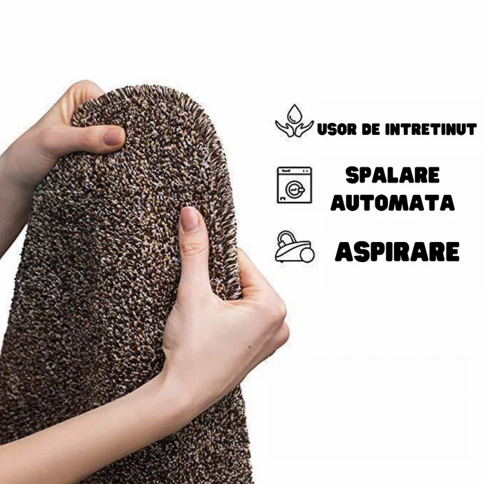 - Absoarbe noroiul, zăpada, nămolul, apa și alte resturi de pe tălpi sau labe de animale. Capacitatea de a absorbi murdăria este atât de mare încât nici nu trebuie să ștergi tălpile patofilor de preș, ci doar treci peste el