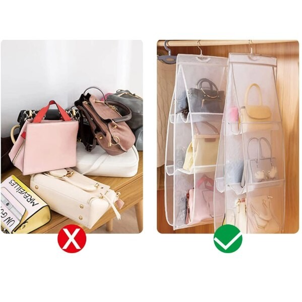 Acest organizator pentru genti este solutia perfecta pentru a mentine ordinea in dulapul tau. Organizatorul este prevazut cu 6 compartimente, care pot fi folosite pentru a depozita o varietate de obiecte, cum ar fi genti, palarii, curele etc.