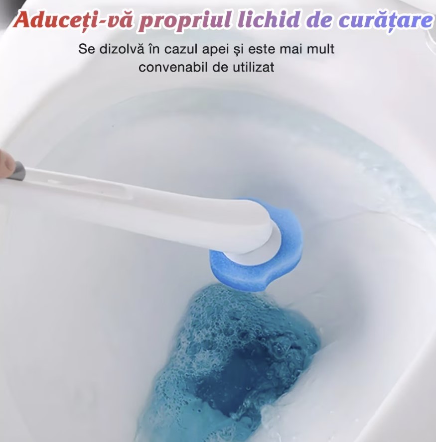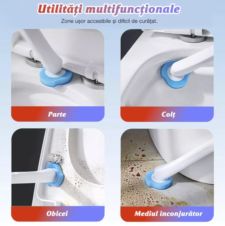 - Este foarte usor de utilizat - tot ce trebuie sa faci este sa fixezi capul de schimb in perie si sa incepi curatarea vasului de toaleta