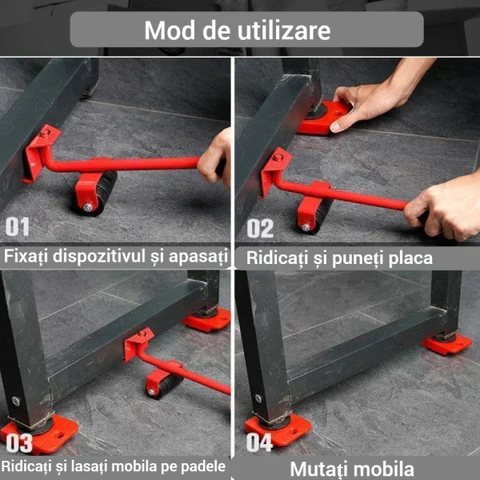 Instrucțiuni de utilizare: Introduceți cricul sub piesa de mobilier, ridicați-l și așezați suporturile în colțuri. Pentru ca cricul să intre mai ușor sub mobilă, înclinați-o. Așezați suporturile sub piesa de mobilier astfel încât rotița să fie orientată pe direcția pe care doriți să deplasați mobila.