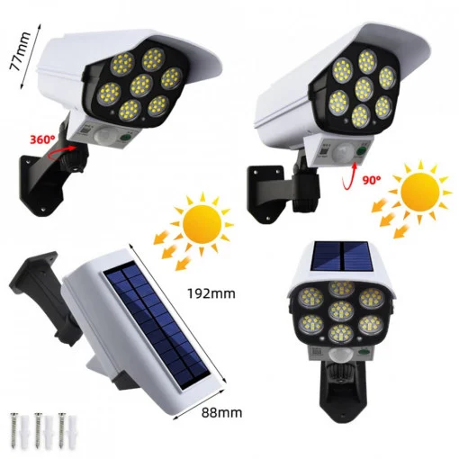 Pastrati casa dvs. in sigurata cu 77 de LED-uri strălucitoare, design cu profil redus, activat prin mișcare, elegant. În plus, camera de securitate realistă falsă. Detectează intrușii Stai departe de gospodăria ta