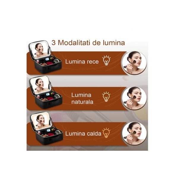 Portabilitate: Geanta cosmetica este conceputa sa fie compacta si usor de transportat. Aceasta va permite sa va luati produsele cosmetice si oglinda oriunde mergeti, facilitand retusurile sau aplicarea de machiaj in miscare.