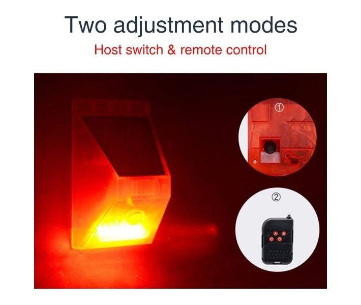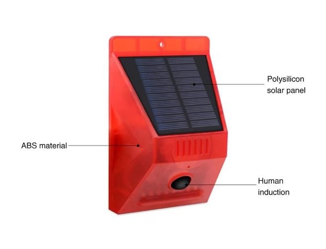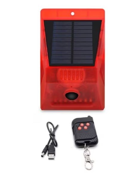 Dispozitiv de alarmă autonom cu montare pe perete, energie solară (și alimentare prin USB 5V) și senzor de mișcare. Încărcat complet în aproximativ 2 ore la priză sau aproximativ 10 în lumina directă a soarelui și are 4 moduri zi și noapte, cu sau fără sunet. Senzorul de miscare functioneaza la un unghi orizontal de 125°, un unghi vertical de 60° si la o distanta de 5-8 metri in functie de temperatura exterioara.