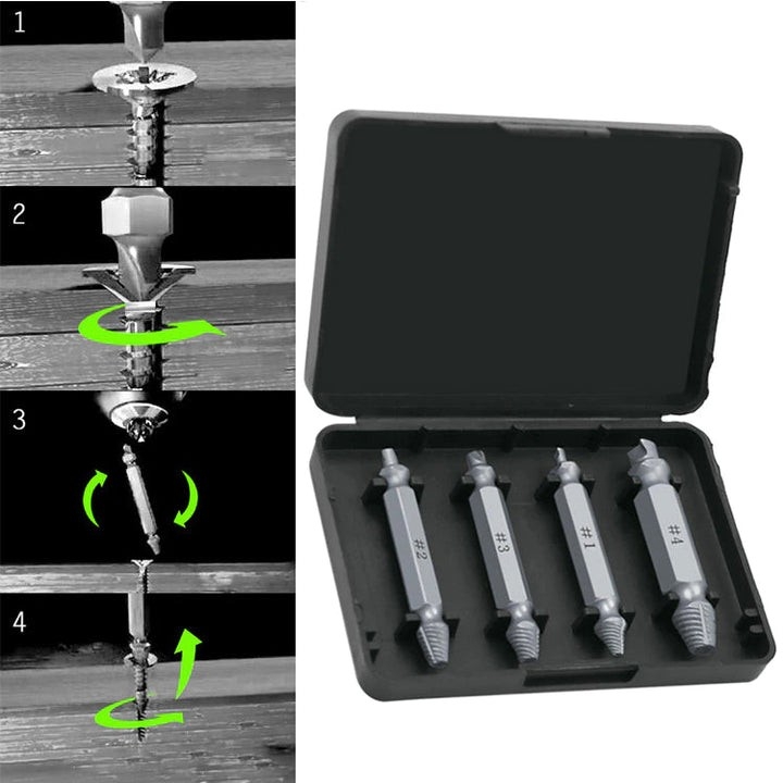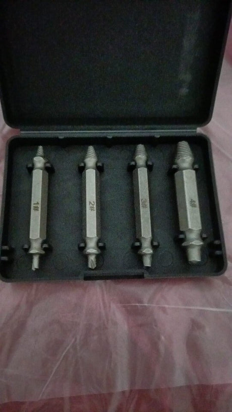 Cele 4 burghie extractoare sunt confectionate din otel rezistent, avand capat special creat, cu canale striate ca sa prinda capatul surubului.