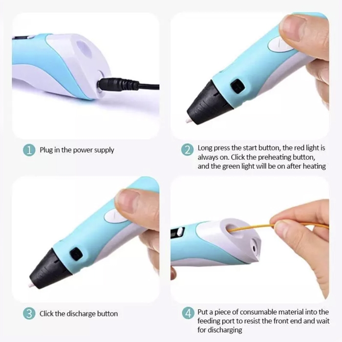 Conectați adaptorul la spatele stiloului și selectați filamentul. Se va aprinde o lumină roșie pentru a indica încălzirea, aceasta va dura aproximativ 2-3 minute. Faceți dublu clic pe butonul pentru a porni și introduceți filamentul prin spatele stiloului. Când filamentul ajunge la duza stiloului, faceți clic pe butonul „înainte” pentru a opri. Apăsați și mențineți apăsat butonul „înainte” sau faceți dublu clic pentru un flux continuu. Când ați terminat cu designul, apăsați și mențineți apăsat butonul „înapoi” pentru a retrage filamentul.